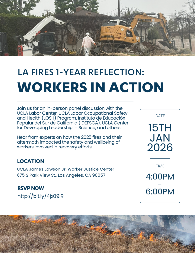 Join us for a panel discussion with the UCLA Labor Center, UCLA Labor Occupational Safety and Health (LOSH) Program, Instituto de Educación Popular del Sur de California (IDEPSCA), UCLA Center for Developing Leadership in Science, and others.