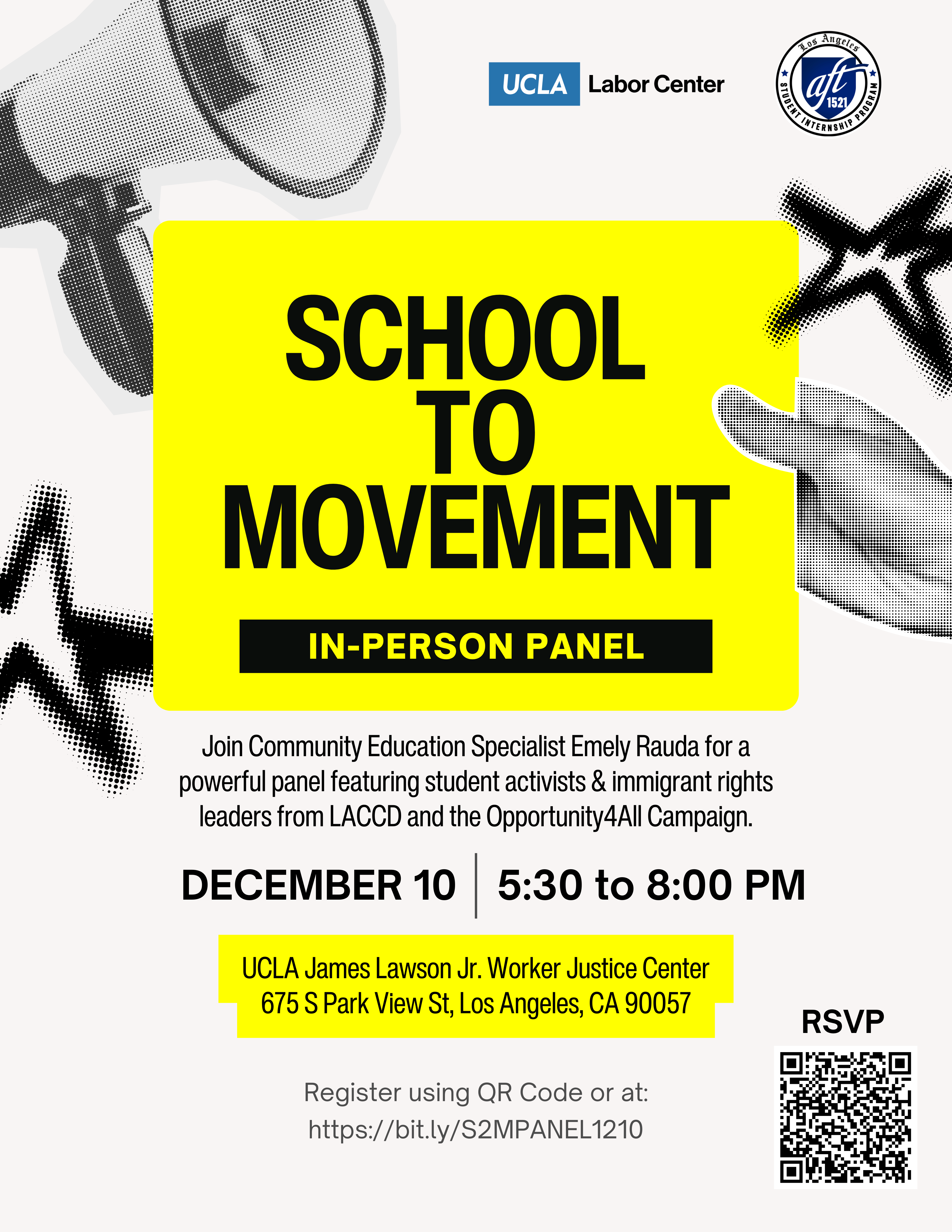 UCLA James Lawson Jr. Worker Justice Center 675 S Park View St, Los Angeles, CA, United StatesUCLA Labor Center's Lawson/Huerta Nonviolence Education Project Presents: School 2 Movement Panel Featuring: Student Activists & Leaders from LACCD and the Opportunity4All Campaign Panel will feature students from AFT1521's Student Internship Program that were part of a summer fellowship with the Nonviolence Education Project. Their summer activities included learning and engaging with immigrant youth mentors on a … Continued